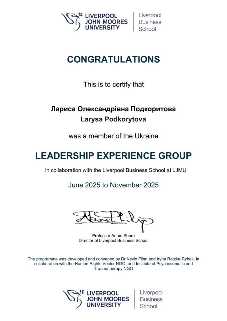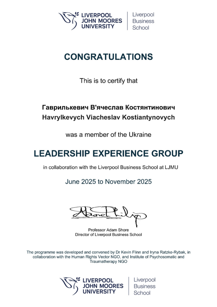 29 грудня 2025 року доценти кафедри психології та педагогіки Хмельницького національного університету В’ячеслав ГАВРИЛЬКЕВИЧ і Лариса ПОДКОРИТОВА успішно відзвітували на комісії Вченої ради університету про результати міжнародного підвищення кваліфікації (стажування) за програмою «Група розвитку лідерського досвіду: осмислення лідерства» («Leadership Experience Group»), яка була розроблена та впроваджена доктором Кевіном Флінном (Англія) та психологинею і психоаналітикинею Іриною Ратцке-Рибак (Німеччина) у співробітництві з Liverpool Business School at Liverpool John Moores University (Liverpool, England) і тривала з 20 червня до 07 листопада 2025 року (онлайн) загальним обсягом 180 годин (6 кредитів ECTS).