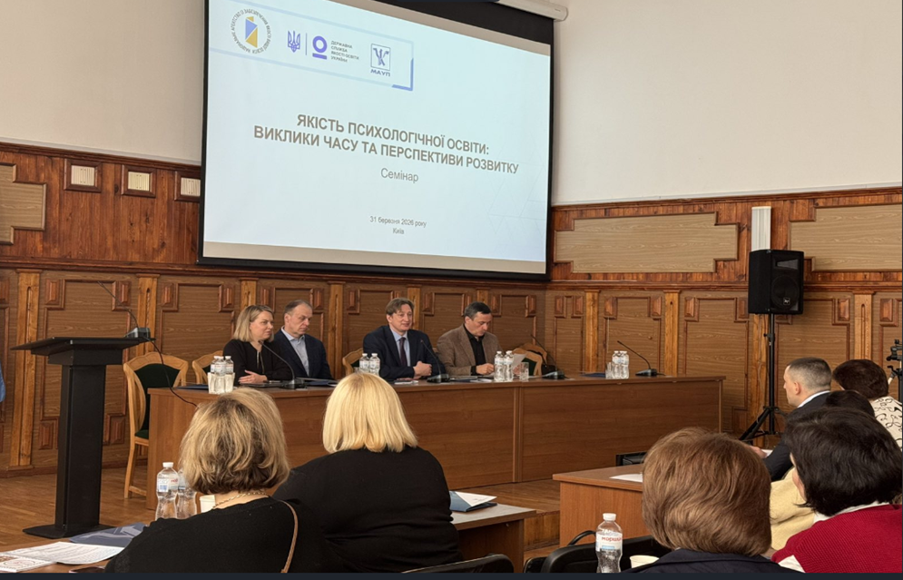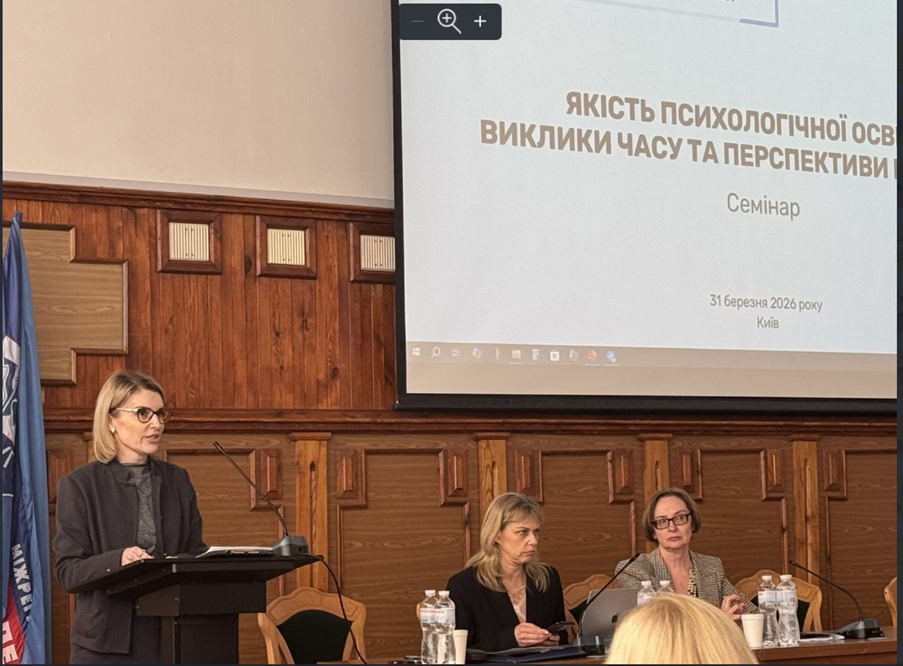 31 березня 2026 року відбувся Всеукраїнський науково-практичний семінар «Якість психологічної освіти: виклики часу та перспективи розвитку», організований Національним агентством із забезпечення якості вищої освіти на базі Міжрегіональної Академії управління персоналом у партнерстві з Державною службою якості освіти України,  у якому взяли участь викладачі кафедри психології та педагогіки Таїсія КОМАР, завідувачка кафедрою, професор, доктор психологічних наук, гарант ОП Психологія другого (магістерського) рівня вищої освіти, та Олена КУЛЕШОВА, доцент, кандидат психологічних наук, гарант ОП Психологія першого (бакалаврського) рівня вищої освіти.
