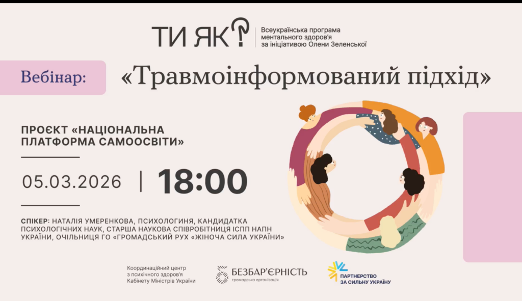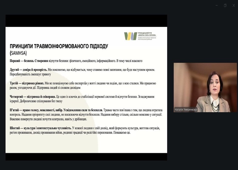 Викладачі та студенти кафедри психології та педагогіки взяли участь у вебінарі «Травмоінформований підхід», присвяченому актуальним питанням підтримки людей, які переживають складні життєві обставини в умовах війни та постійного стресу. Під час вебінару було розглянуто особливості комунікації з людьми, які мають травматичний досвід, принципи травмоінформованості, а також практичні підходи до побудови безпечної та підтримувальної взаємодії. Учасники обговорили реакції людини на стрес, важливість емпатії у професійній діяльності та роль фахівців у створенні психологічно безпечного середовища. Спікеркою заходу виступила Наталія Умеренкова — психологиня, кандидатка психологічних наук, старша наукова співробітниця відділу психології масової комунікації і медіаосвіти Інституту соціальної та політичної психології НАПН України, очільниця Громадського руху «Жіноча Сила України». Під час виступу спікерка наголосила, що війна, втрати, вимушене переміщення та тривалий стрес змінюють спосіб, у який люди реагують на події, спілкуються та приймають рішення. Саме тому травмоінформований підхід допомагає фахівцям краще розуміти поведінку людини, бачити за нею досвід пережитого та будувати взаємодію на основі поваги, безпеки і професійної етики.